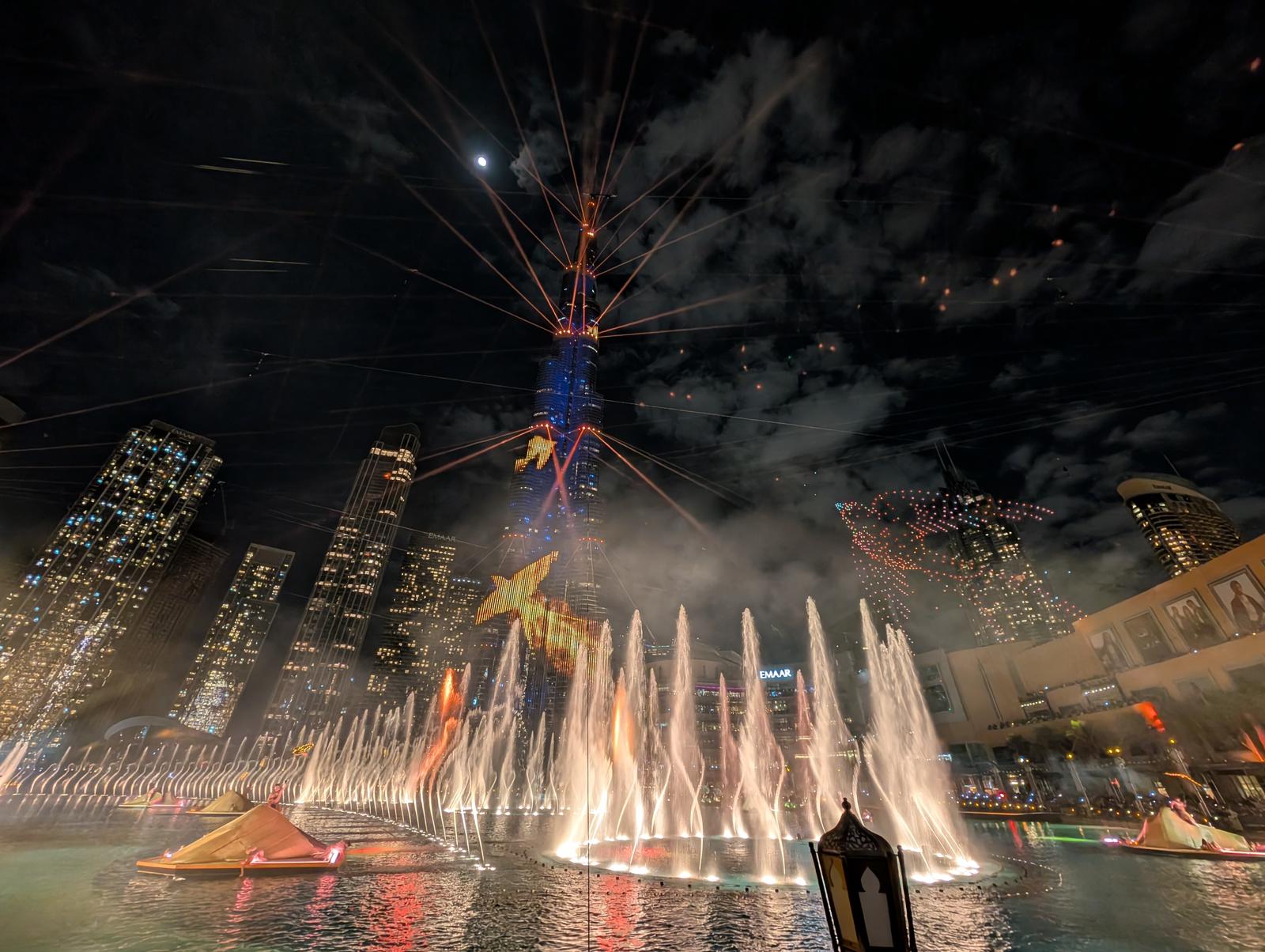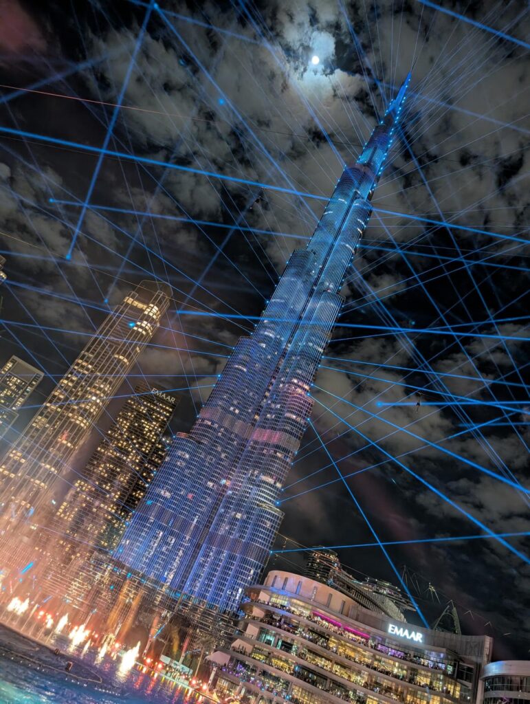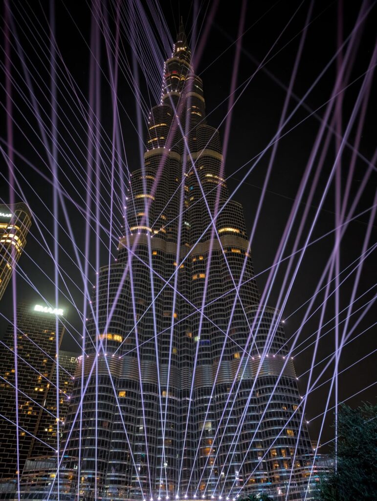 The laser show, designed by Experience Studios, had to tightly integrate with the lighting, pyrotechnics, choreography and the 800m high LED screen of the Burj Khalifa.