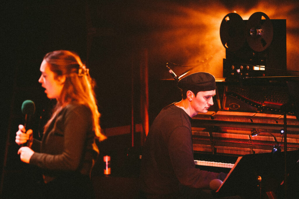 Tape reels, warped from 40+ degree heat, play out field recordings and vocal samples that gracefully dance around the surround sound system created for the show, layering harmoniously while creating space for UK Poet Laureate Simon Armitage to recite words penned specifically for the piece.