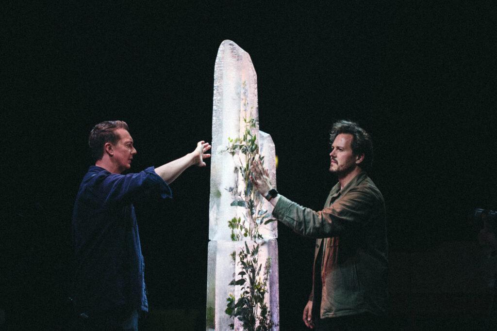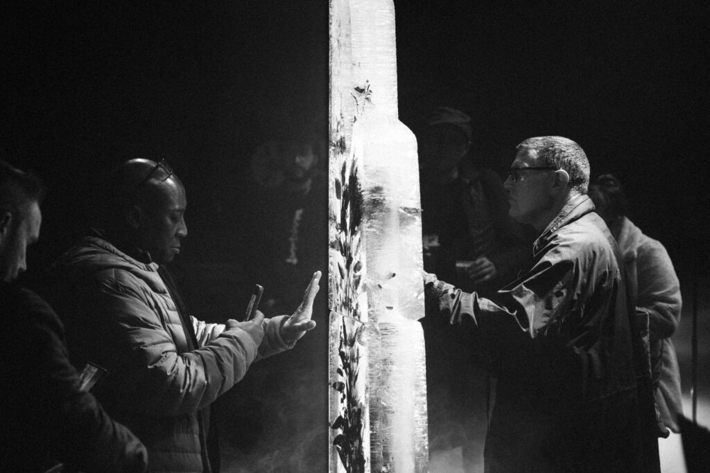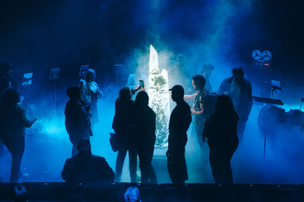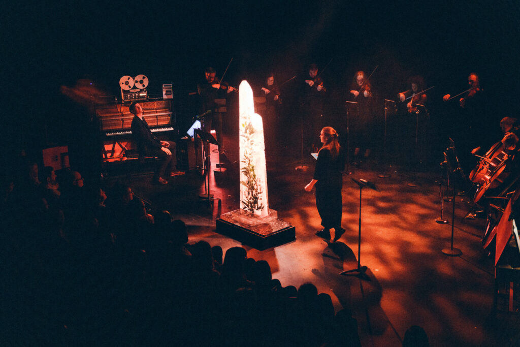 Live on stage, like the record, it is a showcase of the elements, inserting mother nature into the centre of the performance in the form of a monolithic glacial standing stone that thaws and melts throughout the show to expose the planting frozen within. The ice sculpture stands at over two meters tall, in the position – and in place of – the orchestra conductor.