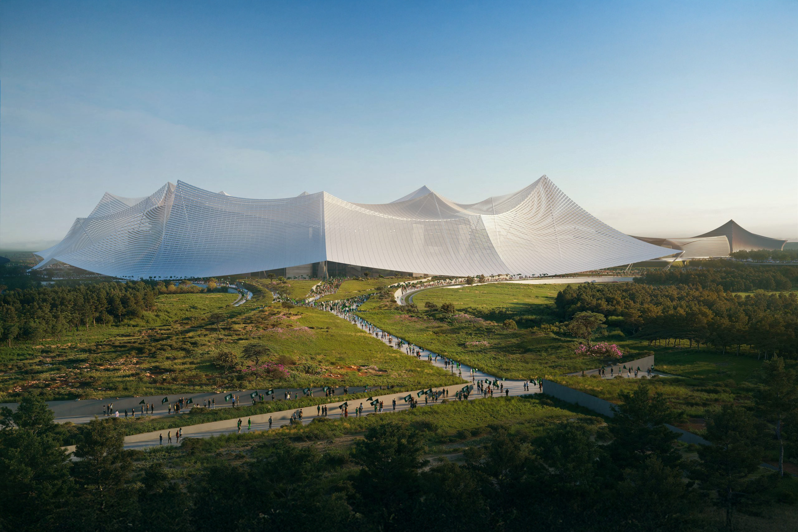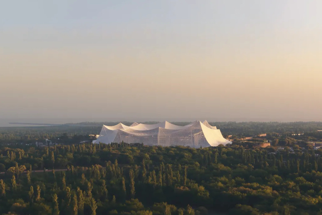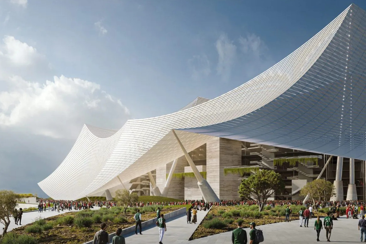 The design draws inspiration from the traditional Moroccan social gathering known as a “moussem,” with the stadium structure set under a grand tented roof that emerges as a dramatic intervention in the forested landscape.