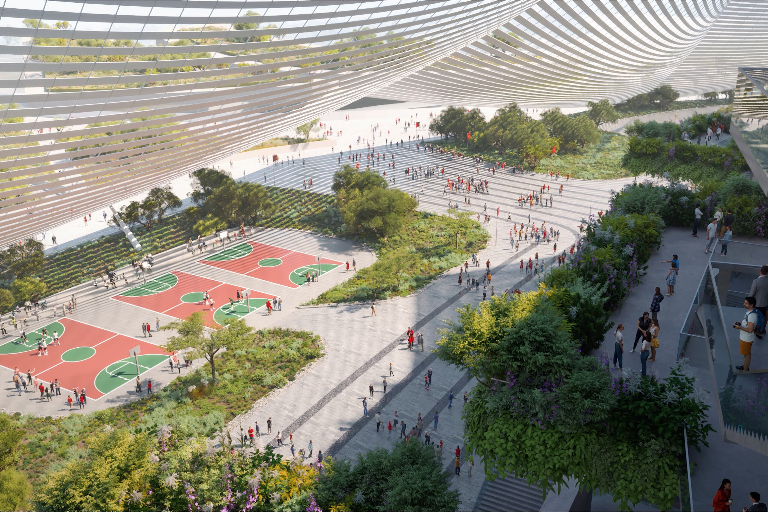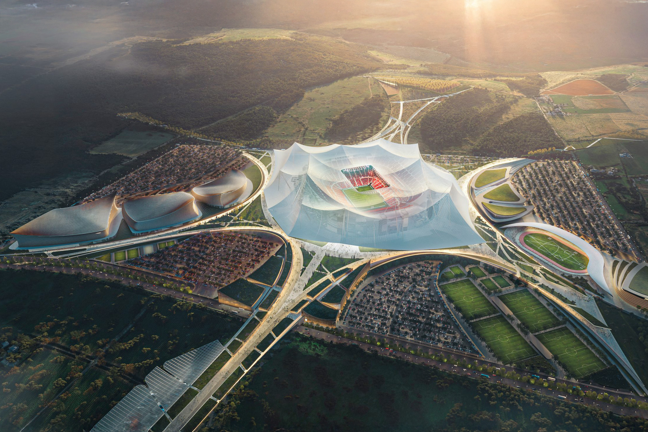 The stadium is covered by a striking roof canopy made from a unique aluminium lattice. Supporting the geometry of the roof and the bowl is a ring of 32 stairways, creating monumental gateways that feature lush gardens positioned on raised platforms, each 28 meters above the ground. The gardens create an extraordinary spatial experience — an oasis of greenery under the translucent roof canopy. This effect is further enhanced by a series of botanical gardens at ground level beneath the outer edges of the canopy.